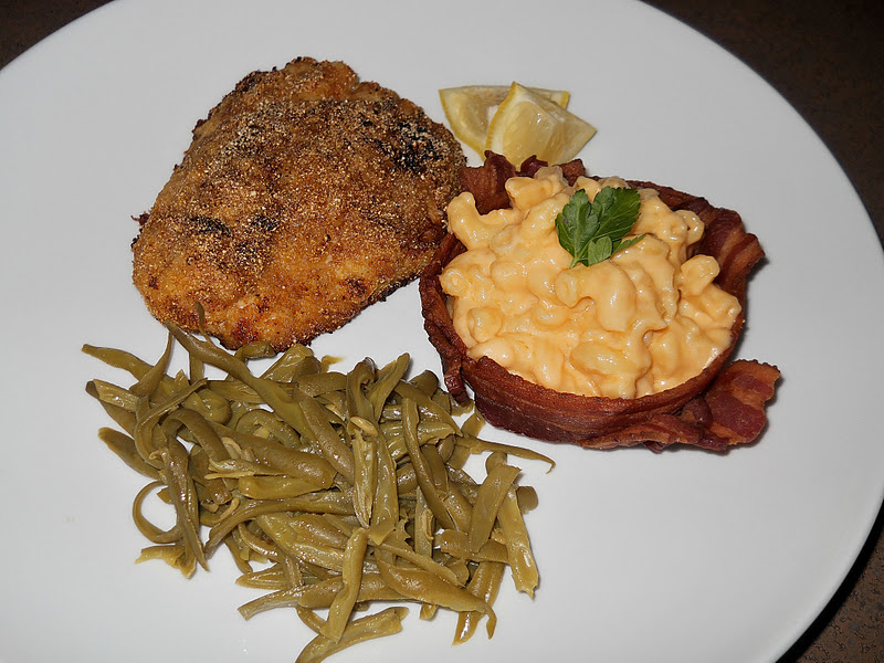Tonight I did a bad thing...aside from the Groundhog 'incident'....tisk-tisk...I jest...So, at this point in my life, I'm sure, to most of you, that is no surprise...which is why I didn't ask you to have a seat...but, it isn't what you were thinking...no boys, toys, mailboxes or police were involved...much to MY chagrin...hahahaahaha..I'm kidding..um, not really...Anyhoo...I somehow managed to channel Paula Deen tonight..and now we can probably share clothes and such...after the calorie-laden meal I consumed this evening...thank heavens for yoga pants...and not that I plan on doing any yoga..but they have a stretchy-waist band...Allow me to introduce....(and we have prolly way too many pics for a Thursday night..) Cajun fried catfish with stovetop mac and cheese in a bacon bowl..oh, we did have some green beans..that's a bonus...