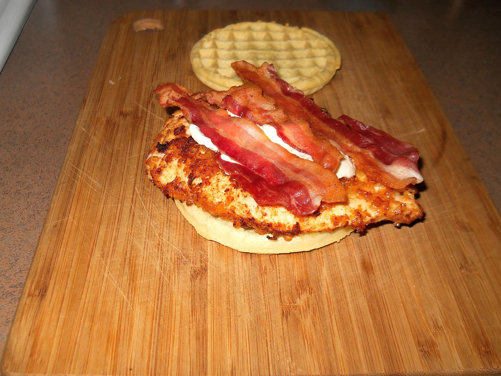 Place cooked chicken atop your waffle...Now, I will admit...we did cheat again tonight...I do not own a waffle iron...I would have definitely preferred a homemade waffle...but I won't be here too much longer and I'm not lugging a waffle iron all the way across the country..so...can we get a little finger clap for Eggo...I toasted them under the broiler...I don't have a toaster either...In fact, there are lots of things I don't have...do you have the time??? hahahahhaha...like that Willis Coach Bag, in Mahogany...I STILL don't have that!